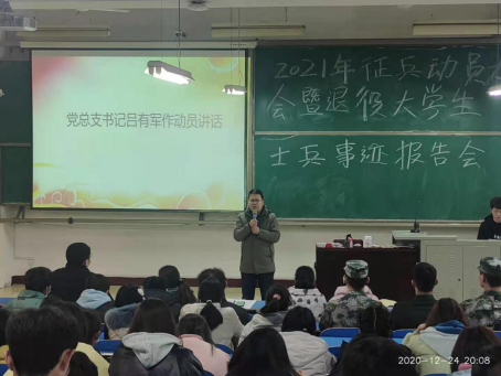为切实做好2021年征兵工作,我院于12月24日晚在A18-204教室召开2021年征兵动员大会暨退役大学生士兵事迹报告会。党总支书记吕有军、党总支副书记李国云及全体辅导员出席了会议。