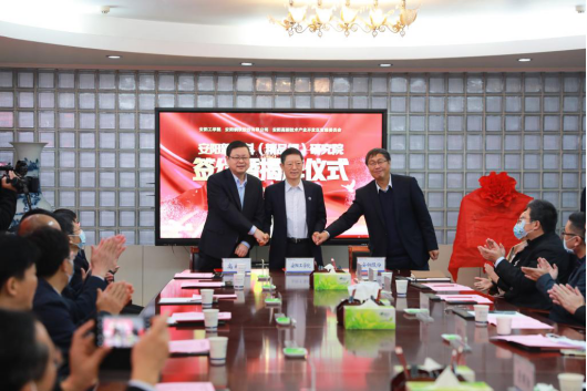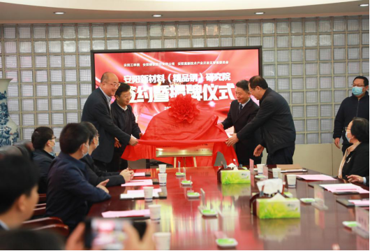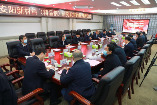 景国勋、商存亮、秦俊洲共同签订《安阳新材料(精品钢)研究院战略合作协议》。高永、刘润生、牛福生、任中普、共同为安阳新材料(精品钢)研究院揭牌。