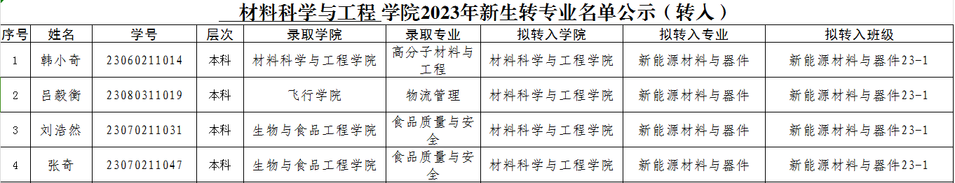 根据教育部《普通高等学校学生管理规定》(教育部第41号令)和河南省教育厅有关做好普通高等学校学籍管理工作文件精神,按照《388vip太阳集团学生转专业管理办法》,我院受理了有转专业意向的学生的书面申请,对申请转专业学生逐个进行了谈话和了解。经学院党政联席会议研究,现将2023年拟同意转入、转出学生的信息公示如下,公示期3天,从2023年12月12日至2023年12月14日,若有异议请实名向材料学院反映。公示结束后,学院将按照学校统一规定办理转专业手续。