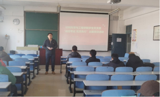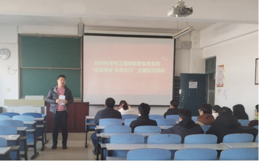 为严肃考风考纪,激励学生党员以身作则,增强诚信考试意识,1月5日中午,我院学生党支部在A14-606教室开展了“诚信考试,党员先行”主题党日活动。