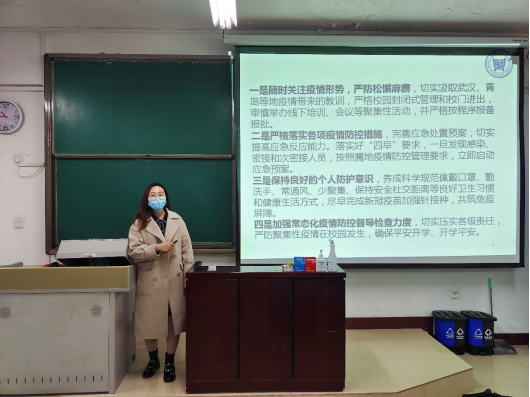 3月9日晚,孟蓝翔老师在A14-606给20级应用物理、20级高分子材料与工程、20级新能源材料与器件三个班召开班会。班会主要从疫情防控、宿舍卫生、晚归、夜不归宿、防诈骗、期末考试存在的问题、学风建设和女足获得亚冠以及中国成功举办冬奥会的成功七个方面进行了详细的介绍。