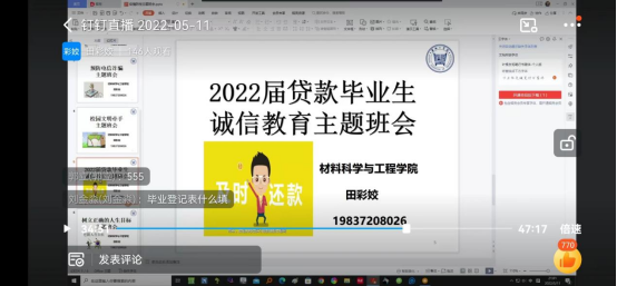 为帮助贷款毕业生树立遵纪守法和诚信理念养成遵纪守法、诚实守信的良好习惯。5月11日,我通过钉钉在线的形式召开了2022贷款毕业生诚信还款教育会议。辅导员田彩姣2022届全体贷款毕业生参加了会议。